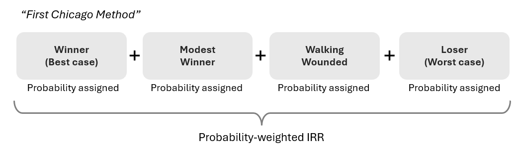 This is how it looks like; it is a slight variation of the “First Chicago Method” which Mark Leonard probably used in its early days as a venture capitalist. The manager assigns the probabilities to each of the four scenarios to calculate a probability-weighted expected return (IRR) and estimated pre-tax FCF.