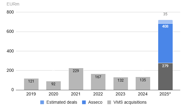 While the market worries about the future of VMS, the Topicus engine is firing on all cylinders. This year alone, the company has deployed approximately ~€725m (utilizing both FCF and debt capacity)—a record number. The contrast is stark: just last year, capital deployment was so slow that Topicus returned cash to shareholders via a special dividend. Today, they are deploying capital faster than they can generate it. This surge in activity suggests that management sees immense value in the market, precisely when investors are most fearful.