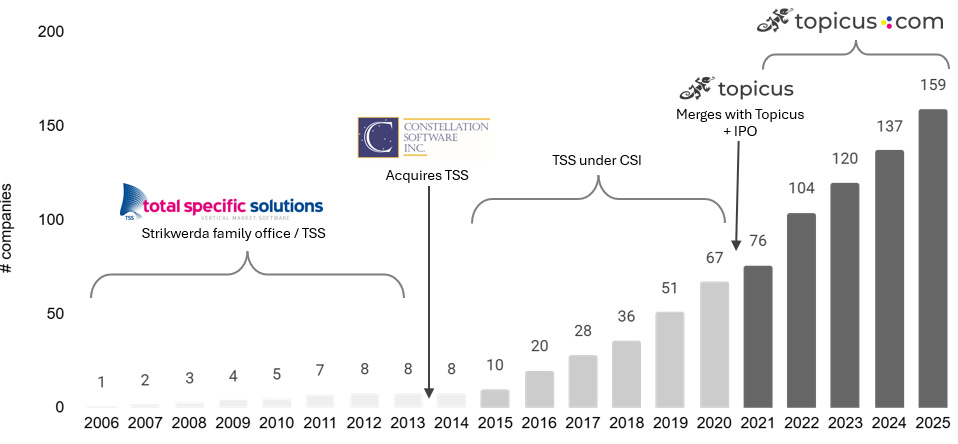 To understand Topicus effectively, we must first step back and examine its parent, Constellation Software (CSI). Topicus is not merely a European carbon copy of the world’s most successful serial acquirer; it is a unique hybrid created in 2021. The company was formed by merging one of CSI’s existing operating groups, Total Specific Solutions (TSS), with a separate Dutch software company called Topicus.com B.V. The combination was specifically designed to succeed in the European market, which is highly fragmented by diverse languages, laws, and cultures.