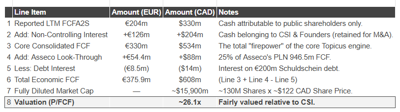 Asseco is a complex holding that consolidates many subsidiaries where it does not hold 100% ownership. Fortunately, in their latest presentation (3Q ’25), Asseco reported its own LTM FCF adjusted for its non-controlling shareholders: PLN 946.5m. Topicus’s ~25% share of this equates to roughly €54.4m. After deducting the estimated interest on the €200m Schuldschein (~€8.5m), the net look-through contribution is ~€45.9m.