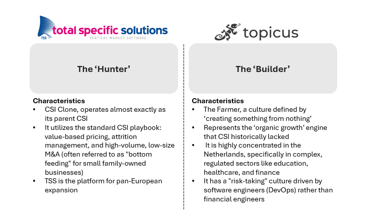 Historically, Topicus BV reinvested almost every euro of profit back into the business to fund growth and innovation, whereas CSI focuses on distributing cash or solely funding acquisitions. While the “Hunter” culture has won the leadership battle, I believe the lingering influence of the “Builder” DNA is why organic growth at Topicus remains stronger than at CSI. Ultimately, the value of the company may well depend on this ongoing friction: the discipline of the Hunters preventing waste, and the creativity of the Builders preventing stagnation.